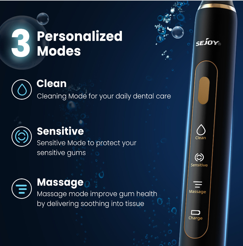 • Three Optional Brushing Modes:Customize your experience according to your teeth condition.Clean (regular brushing), Sensitive (soft),Message (gentle invert frequency).IPX7 waterproof design,enjoy the brushing time,no matter showering or bathing.