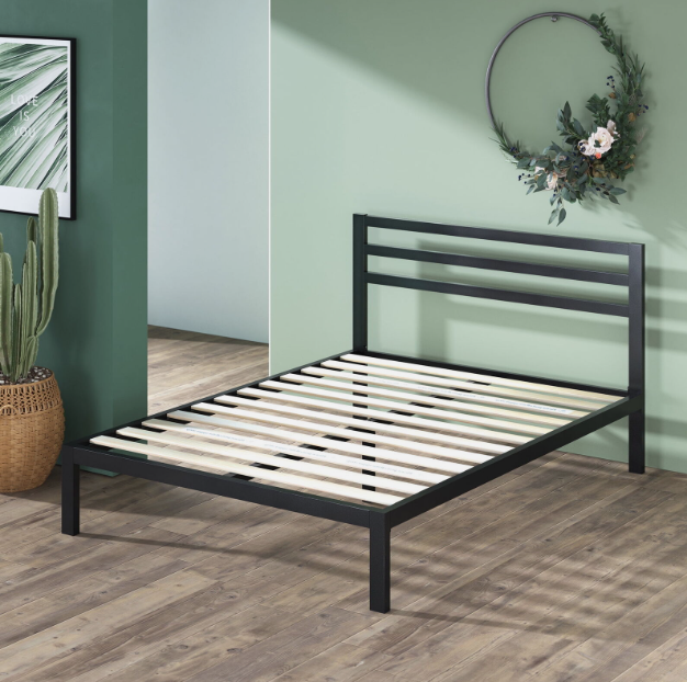 Made with bold style and optimum strength, the steel framed Mia Platform Bed with Headboard features a thick black metal frame and wooden slats that provide strong support for your memory foam, latex or spring mattress without the need for a box spring. And at 14 inches high, it offers over a foot of clearance under the frame for valuable under bed storage so you can tuck your extra boxes or bins neatly away. Crafted with clean lines and a streamlined look, this contemporary modern design looks classic and composed in just about any home. We ship this bed and everything you need to seamlessly assemble it in one slim and compact box that arrives at your doorstep. It’s all ready to be set up in under an hour with the help of a friend. And best of all, it includes a 5-year worry-free warranty guaranteed to keep you from ever losing any sleep over this purchase. Who would have guessed that stylish and strong mattress support could be this simple, convenient and affordably priced?
